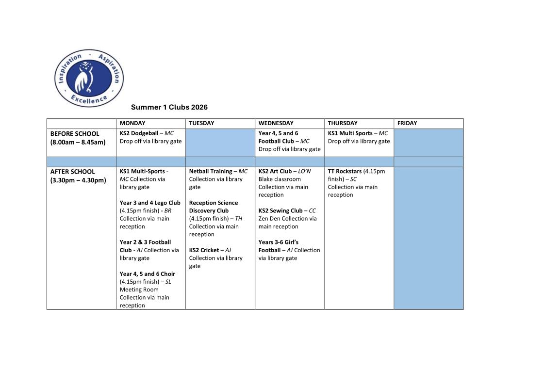 Please see below the clubs rota for spring 2 half term 2026: